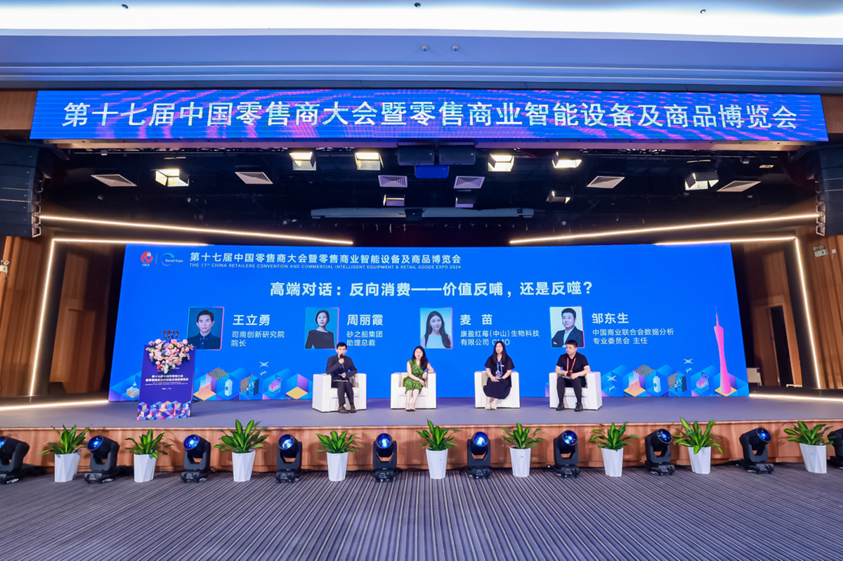 在高端對話環(huán)節(jié),司南創(chuàng)新研究院院長王立勇、砂之船集團助理總裁兼分公司總經(jīng)理周麗霞、康盈紅莓(中山)生物科技有限公司CMO麥苗、中國商業(yè)聯(lián)合會數(shù)據(jù)分析專業(yè)委員會主任鄒東生就“反向消費-價值反哺,還是反噬?”這一話題進行了深入討論,為與會者提供了獨特的視角和思考。
